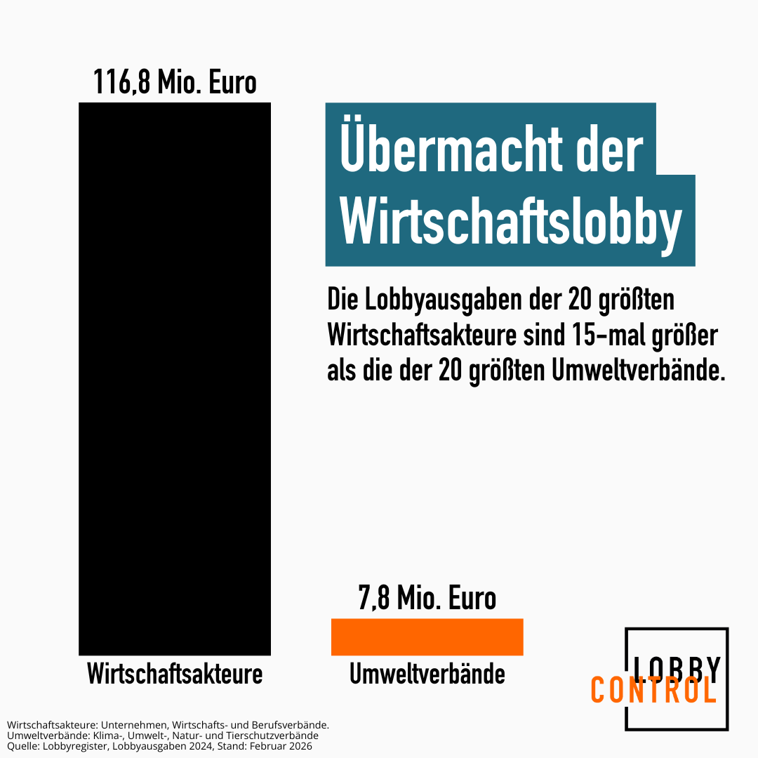 Zu den 100 größten Lobbyakteuren zählen nur sieben gemeinwohlorientierte Organisationen, aber 84 Akteure mit Wirtschaftsinteressen. Von diesen Akteuren gibt die Wirtschaftslobby mehr als 7-mal so viel aus wie gemeinwohlorientierte NGOs. Damit hat sich das Machtungleichgewicht zwischen wenigen NGOs und einer finanzstarken Wirtschaftslobby weiter verschärft.