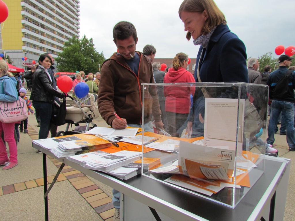 Gestern sind wir das erste Mal mit unserer Aktion „Meine Stimme gegen Lobbyismus – für Demokratie“ auf die Straße gegangen. Parallel zu einer Wahlkundgebung der Linken mit Gregor Gysi in Berlin-Marzahn sammelten wir vor Ort Stimmen und Botschaften.