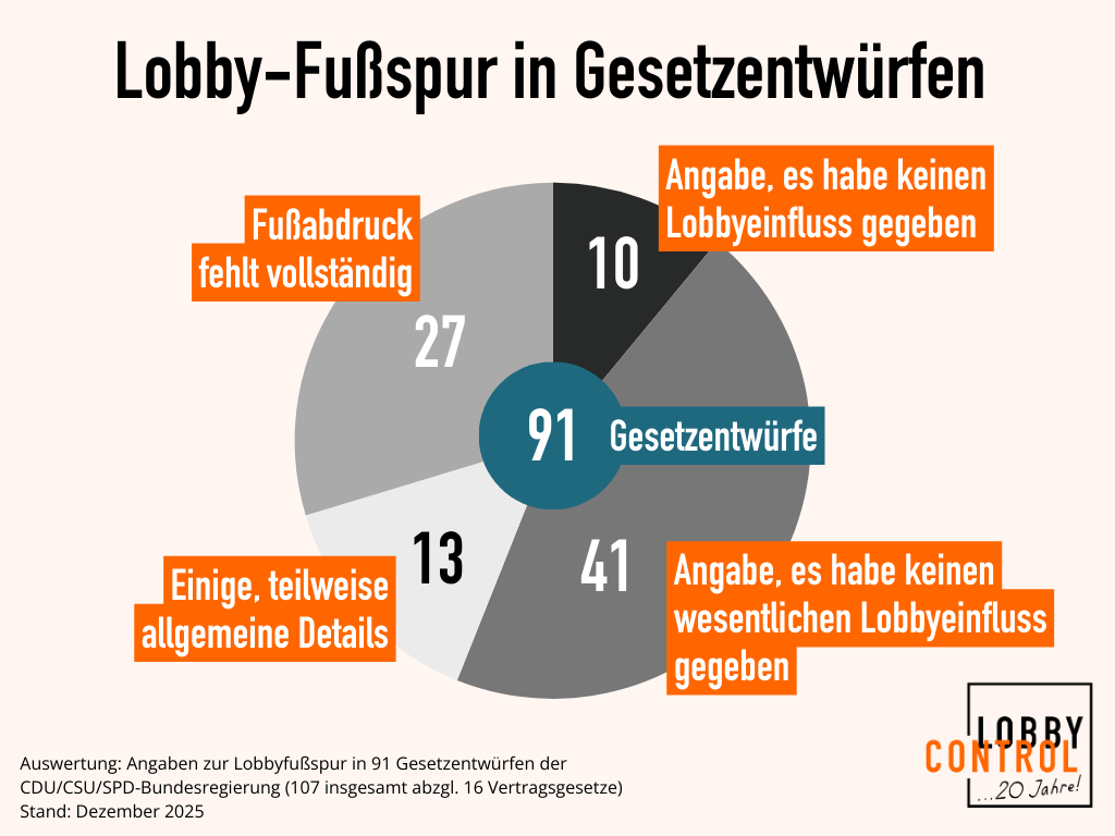 91 Gesetzentwürfe hat die schwarz-rote Bundesregierung seit Beginn der Wahlperiode dem Bundestag vorgelegt. Doch nur 13 davon enthalten überhaupt Angaben zum Interesseneinfluss auf den Entwurf – und das zum Teil auch nur sehr allgemein. Bei 27 Gesetzentwürfen fehlt die Kategorie „exekutiver Fußabdruck“ schon von vornherein ganz. Bei fast der Hälfte der Entwürfe ist lediglich vermerkt, Interessenvertreter*innen hätten keinen „wesentlichen“ Einfluss auf den Entwurf gehabt. Das ist nicht zielführend.