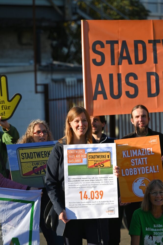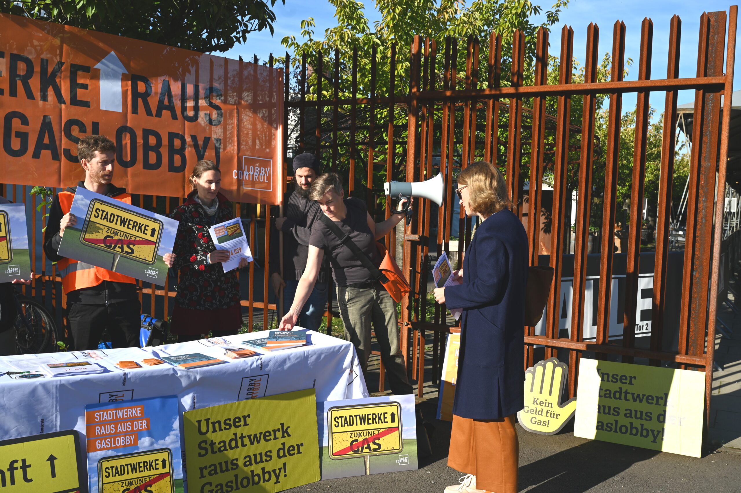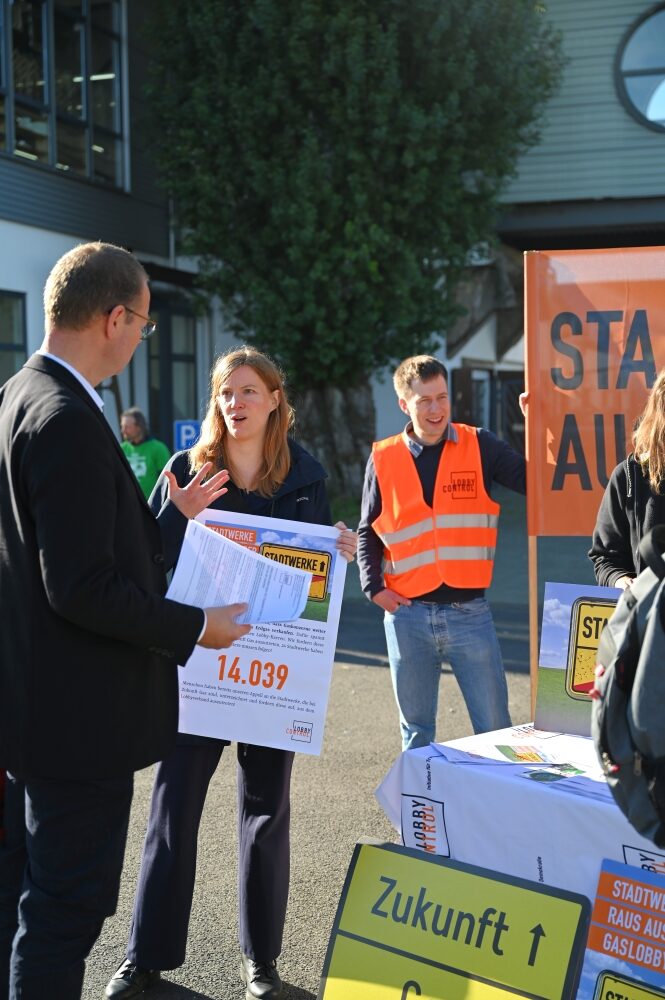 Wir wollten der Gaslobby nicht das Feld in Köln überlassen. Deshalb waren wir mit unserer eigenen Botschaft vor Ort: Stadtwerke sollten sich unabhängig machen von den Interessen der Gaslobby. Mit Bannern, Schildern und Flyern waren wir dort nicht zu übersehen. Während unserer Aktion vor dem Kongressgelände kamen wir auch mit einigen Besucherinnen und Besuchern ins Gespräch.