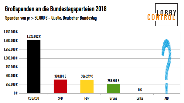 Insgesamt flossen an die Bundestagsparteien im vergangenen Jahr mehr als 3,5 Millionen Euro an Großspenden von jeweils über 50.000 Euro. Mit Abstand am meisten kassierte wie immer die Union mit mehr als 1,5 Millionen Euro, vor der SPD mit 390.001 Euro, FDP (386.249 Euro) und Grünen (258.501 Euro). Die AfD wiederum profitiert seit Jahren von verdeckter Wahlkampfhilfe im zweistelligen Millionenbereich – diese Beträge tauchen in den offiziellen Statistiken jedoch nicht auf (s. unten).