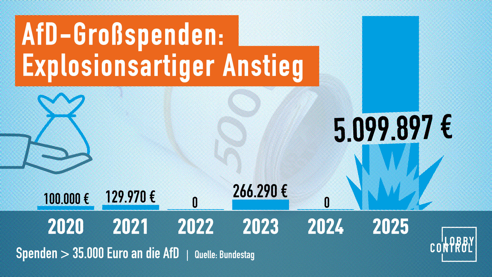 - Die AfD steigerte ihre Einnahmen aus Großspenden von so gut wie nichts auf über 5 Millionen Euro im Jahr 2025. Es gibt erhebliche Verdachtsmomente auf Strohmannspenden.