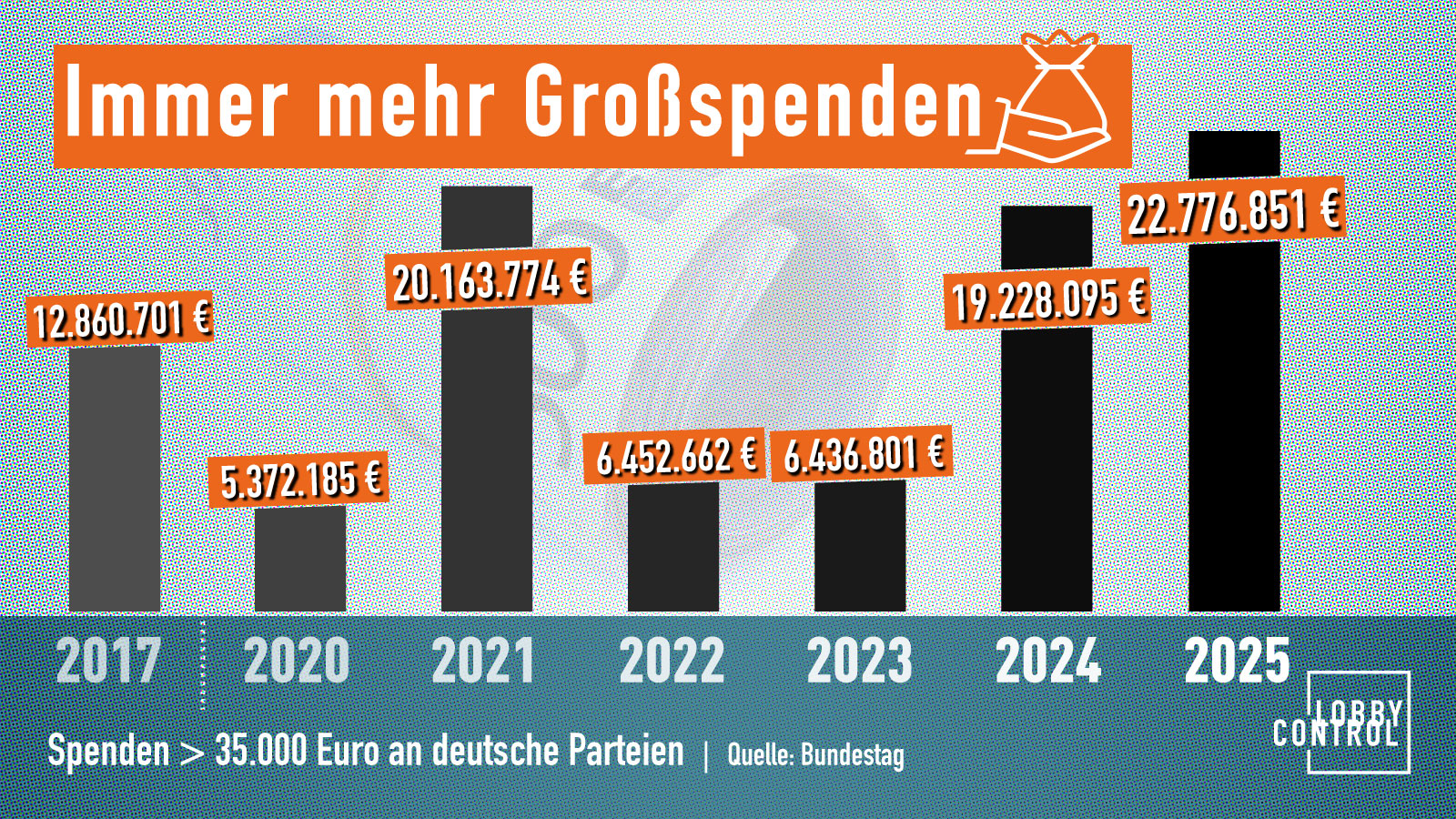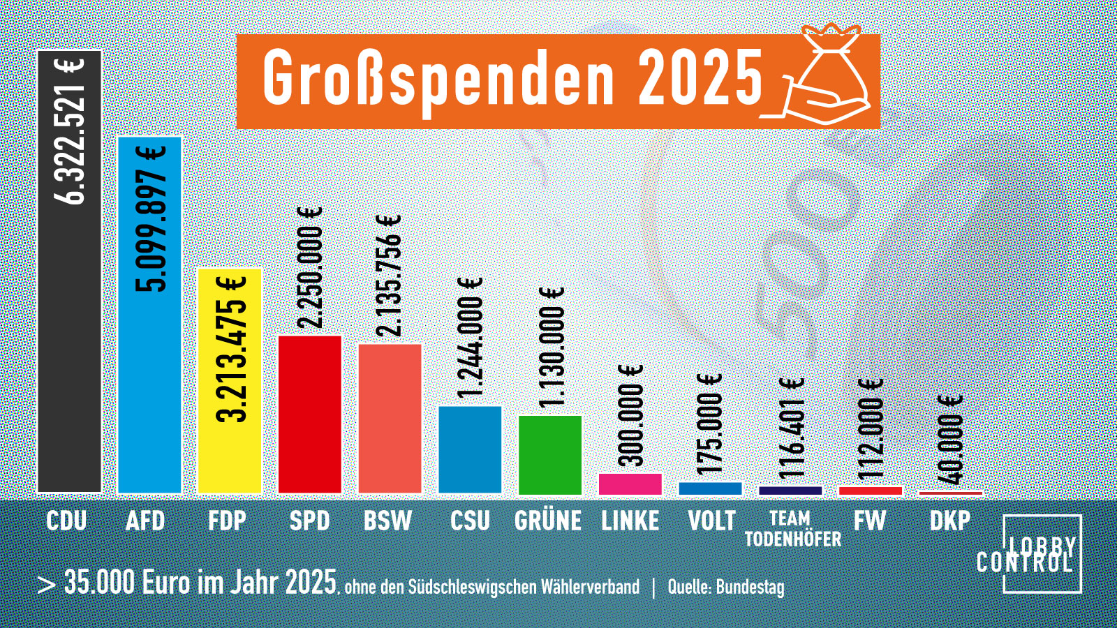 Bereits im Herbst 2024 hatten wir einen Bundestagswahlkampf mit Rekordspenden prophezeit, doch dieses Ergebnis überrascht nun auch uns. Wir haben die Spenden über 35.000 Euro für die Jahre 2025 und 2024 ausgewertet. Das Ergebnis: Großspenden steigen so stark an, dass sie unsere Demokratie immer mehr gefährden.