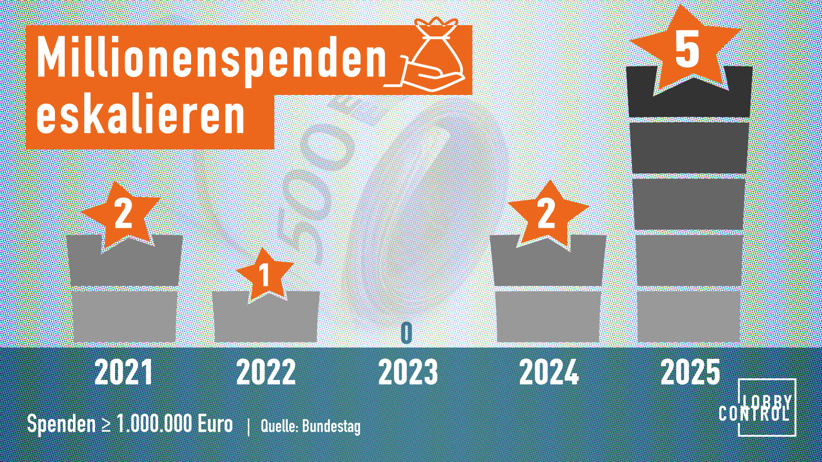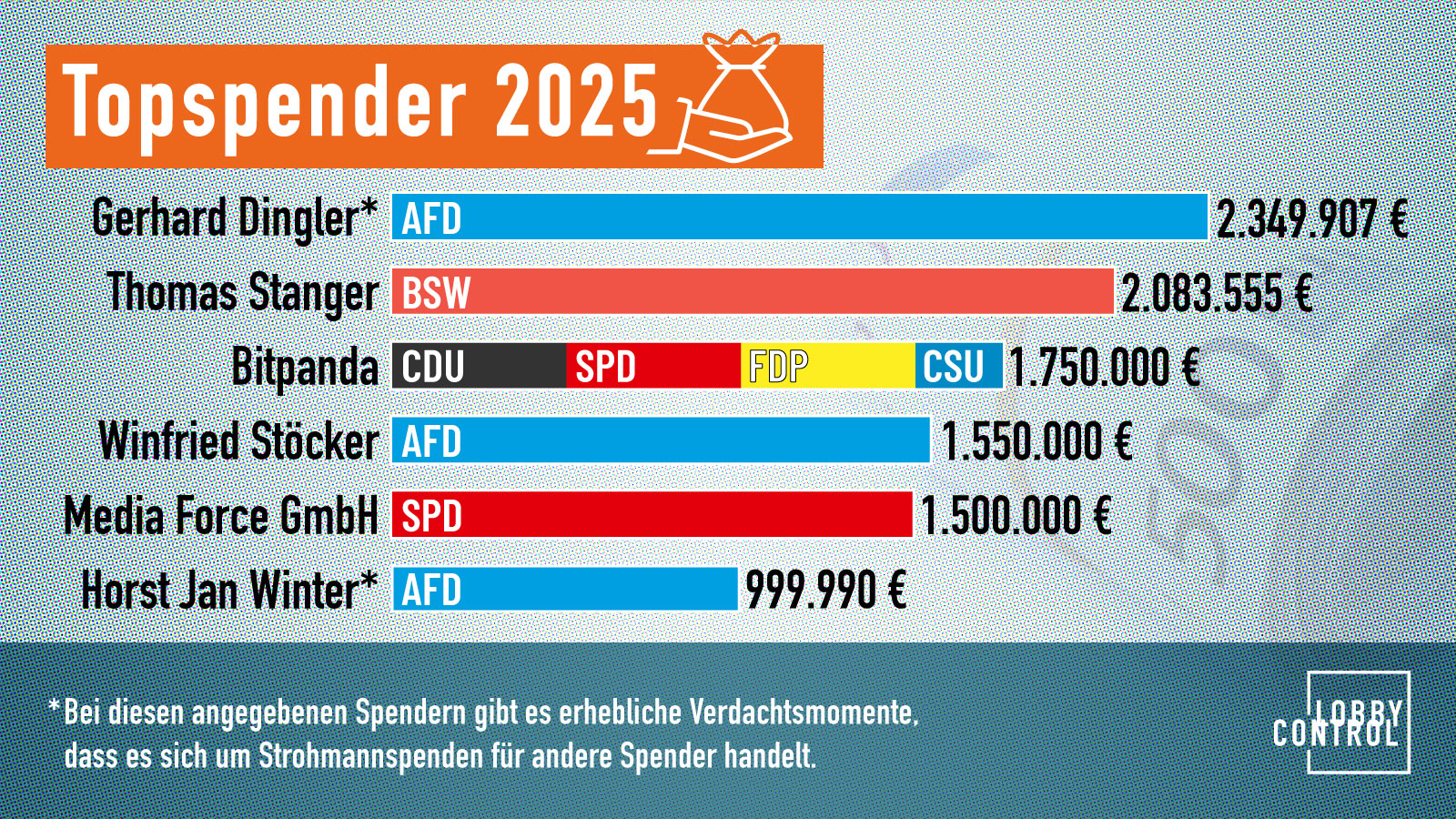- Auch die Spendenbeträge eskalieren zunehmend. 2024/25 gab es sieben Großspenden über einer Million Euro. So hohe Einzelspenden sind besonders problematisch für die Demokratie.