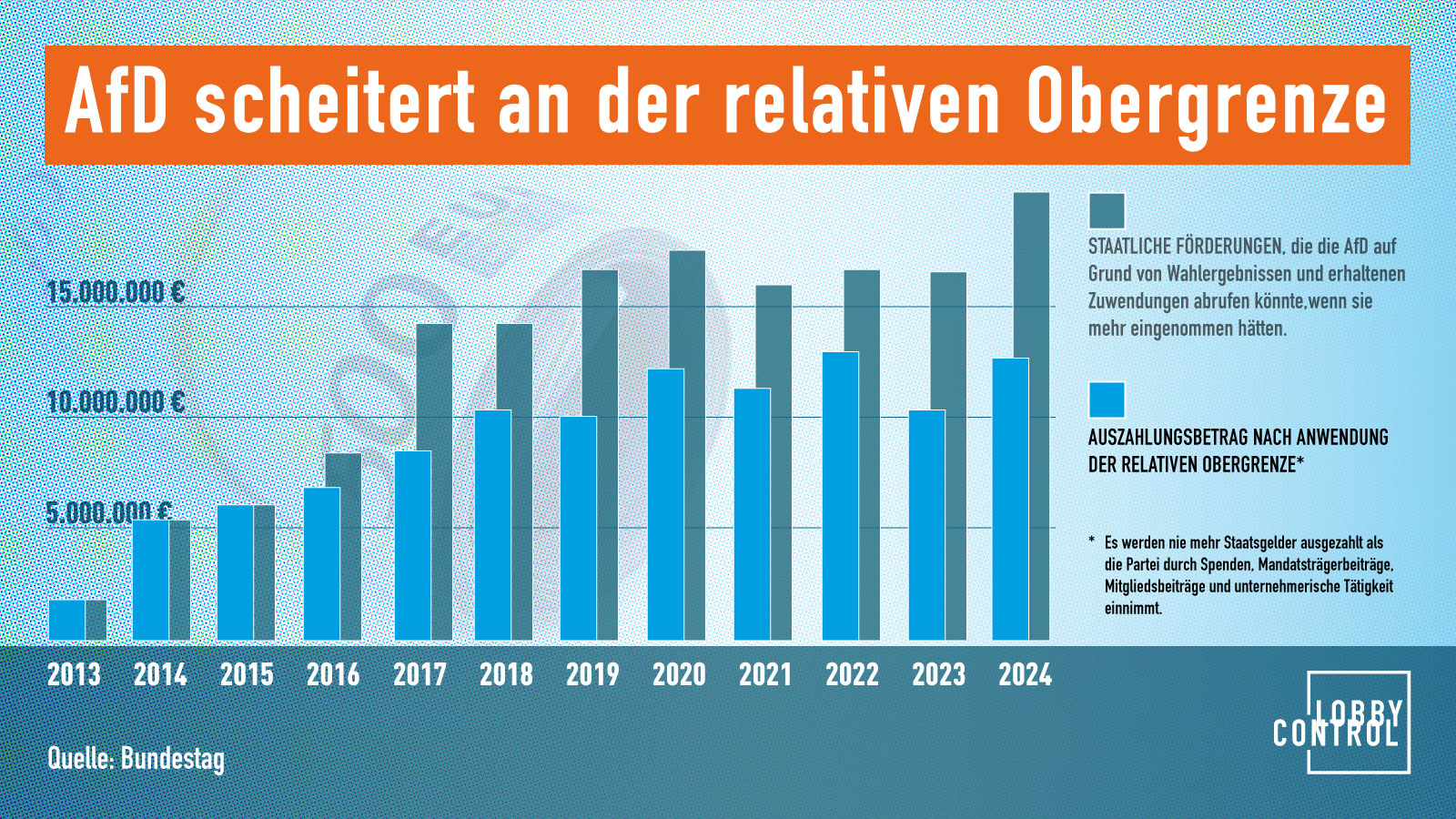 Die einzige Partei im Bundestag, die bisher konsequent an dieser relativen Obergrenze scheitert, ist die AfD. Seit 2015 hat die AfD nicht mehr genug eingenommen, um die vollen staatlichen Mittel einzunehmen. In den zwei Jahren davor erreichte sie die Schwelle nur, weil sie dank einer inzwischen geschlossenen Gesetzeslücke ihre Einnahmen noch künstlich in die Höhe treiben konnte, indem sie Gold zum Marktwert an- und wieder verkaufte.