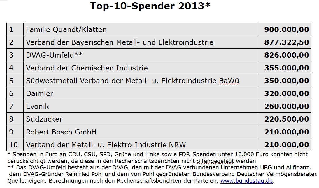 Der BMW-Konzern selbst befindet sich nicht mehr unter den TOP 10. Wie berichtet, stellte BMW ab 2013 seine Strategie der Parteienfinanzierung um. Statt den Parteien wie in den Vorjahren im großen Stil entgeltfrei Fahrzeuge zu überlassen, konzentriert sich der Autobauer nun auf das völlig intransparente Sponsoring. Sponsoringeinnahmen müssen die Parteien nicht gesondert offenlegen. Mit der Familie Quandt/Klatten und dem Bayerischen Metall- und Elektroverband flossen aber auch 2013 weiter große Summen aus dem erweiterten BMW-Umfeld in Form von klassischen Spenden an die Parteien.
