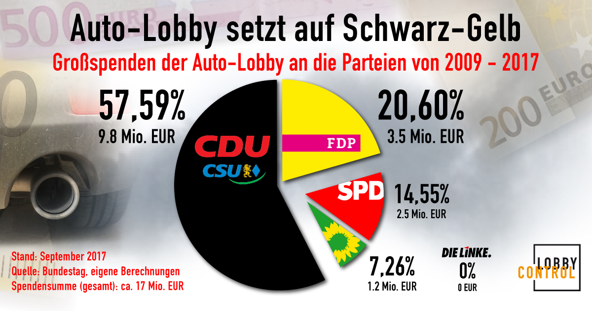 Berlin, 12.09.2017 – Kurz vor Eröffnung der Internationalen Automobil-Ausstellung in Frankfurt hat LobbyControl neue Zahlen über Geldflüsse der Auto-Lobby an deutsche Parteien veröffentlicht. Seit 2009 spendeten demnach Automobilhersteller, Zulieferer und Verbände über 17 Millionen Euro an CDU/CSU, FDP, SPD und Grüne. Fast vier Fünftel des Geldes gingen an Union und FDP.