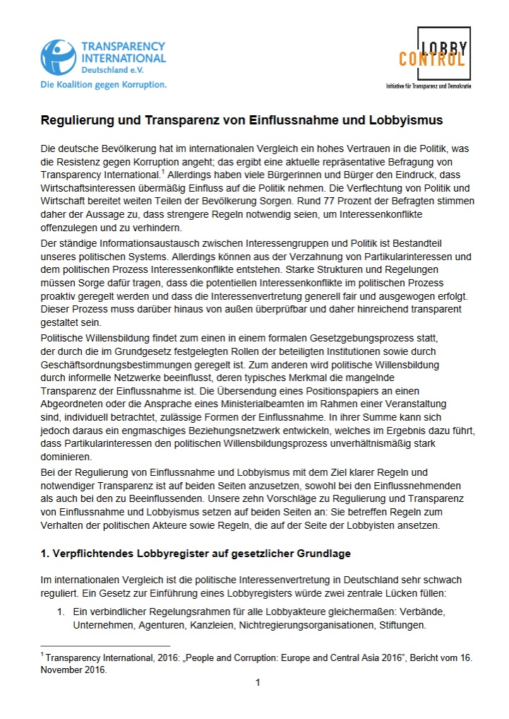 Zehn-Punkte-Plan: Transparency und LobbyControl fordern Regeln für Lobbyismus