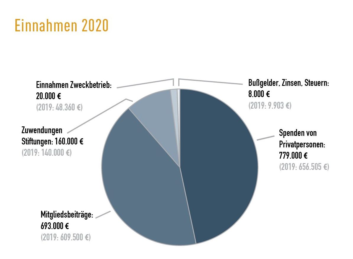 Die institutionelle Förderung durch Stiftungen blieb auch 2020 bei 10 % unserer Einnahmen. Zuwendungen von institutionellen Spendern geben wir ab 100 Euro an. 2020 erhielten wir 60.000 Euro von unserem langjährigen Förderer, der Olin gGmbH, die uns erfreulicherweise auch für 2021 eine Unterstützung in Höhe von 100.000 Euro zugesichert hat. Seit 2018 unterstützt uns zudem die Schöpflin Stiftung, im Jahr 2020 mit 100.000 Euro. Auch die Schöpflin Stiftung hat uns bereits eine weitere Förderung für 2021 in Höhe von 100.000 Euro zugesagt, worüber wir uns sehr freuen.
